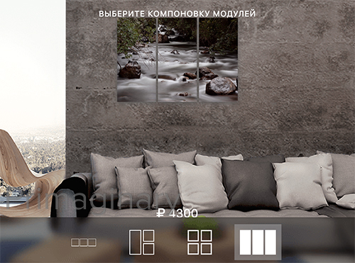 Чтобы вам было максимально просто пердставить, как будет выглядеть ваша будущая модульная картина в реальности, мы добавили в наш конструктор несколько интерьеров. Вы можете выбрать наиболее подходящий из них, можете изменить цвет стен, экспериментировать с размерами и формой будущей модульной картины.